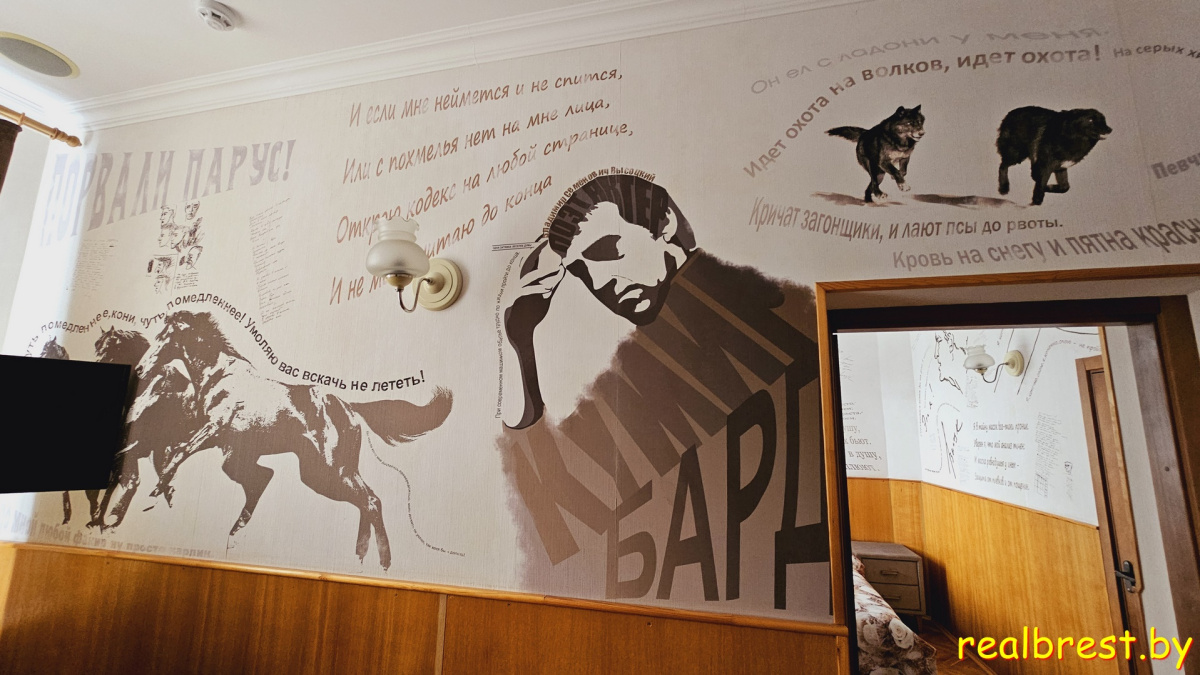 Интерьер дополняют фотообои с изображениями артиста и его супруги. На стенах можно прочесть написанные рукой Высоцкого стихи – их скопировали с оригиналов.