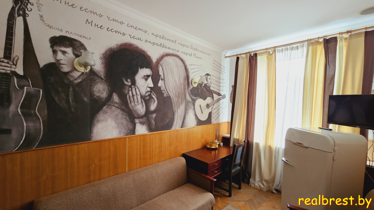 Атмосферу советской эпохи в номере восстановили благодаря старой мебели. Стены номера украсили фотообоями с изображениями Высоцкого и его стихов. В спальне есть проектор, с помощью которого можно посмотреть выступления и интервью артиста.