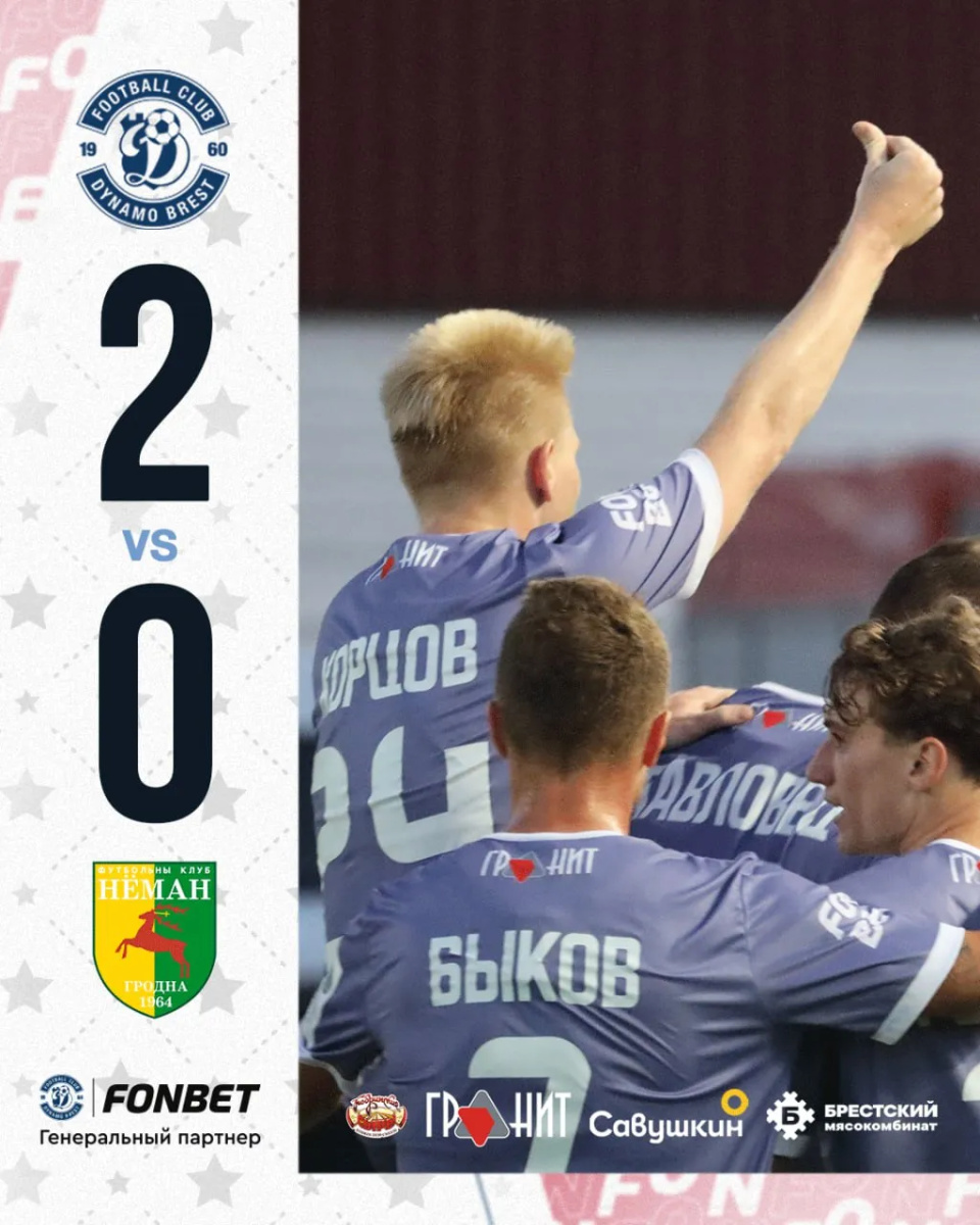 Первый тайм сегодняшнего поединка в Бресте прошел с преимуществом хозяев, которые дважды поразили ворота соперников - на 18-й минуте отличился капитан команды Михаил Гордейчук, а незадолго до перерыва второй мяч забил Егор Корцов. Во второй половине встречи гости не смогли отыграть хотя бы один мяч - брестчане победили с сухим счетом 2:0.