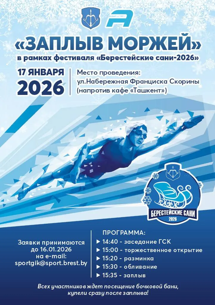 Дорогие друзья! В рамках фестиваля «Берестейские сани» мы приглашаем вас на одно из самых зрелищных событий — заплыв «моржей» на набережной реки Мухавец!