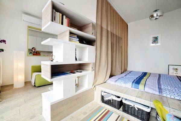 Для маленькой «однушки» появление еще одного члена семьи – это, конечно, радость для родителей, но в плане их комфорта – настоящая катастрофа. Пока он еще младенец и размещается в течение дня в своей кроватке, которую можно поставить рядом с кроватью родителей, это еще сносно. Но ребенок растет, и ему уже мало ковра возле дивана и ящика с игрушками, и не успеют родители оглянуться, как ему потребуется отдельный отгороженный угол. Лучше если такое место будет самым светлым и уютным из всего пространства квартиры. Даже маленькому первокласснику иногда хочется уединиться, и такое уединение можно создать для него с помощью ширмы. Чтобы создать видимость отдельного пространства, можно на месте будущего рабочего места школьника сделать небольшой подиум. Если детей двое, то проблему можно решить с помощью двухъярусной кровати. А вот от крупногабаритной мебели в таком случае придется отказаться. Если в однокомнатной квартире есть лоджия, то ее можно утеплить, остеклить и вынести такую мебель на лоджию, ведь нужно где-то хранить сезонные вещи и те вещи, которые нужны время от времени.