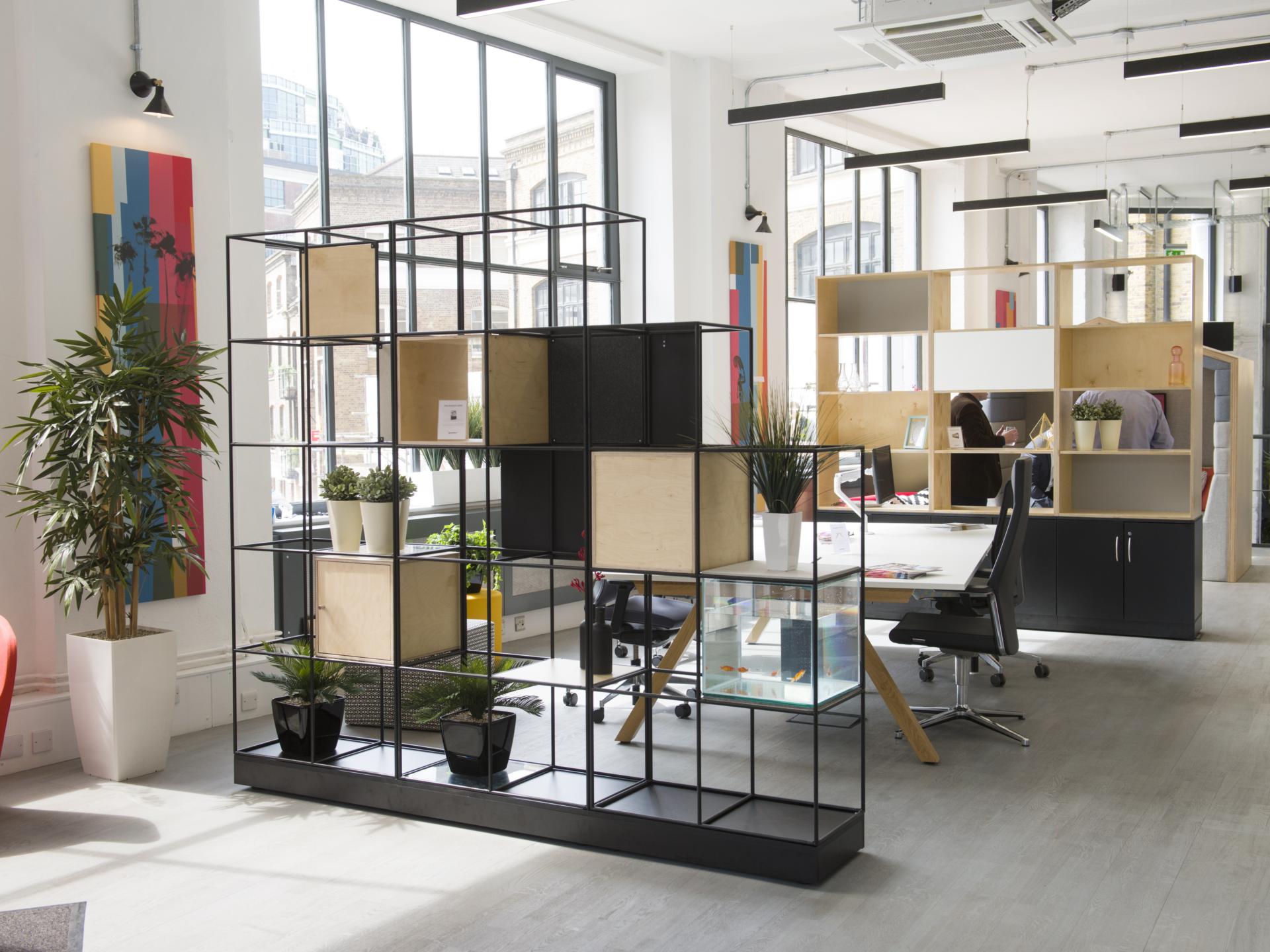 Отделение одного рабочего места от другого или рабочего пространства от зоны общего пользования можно при помощи крупногабаритной мебели. Например, использование стеллажей решит сразу две проблемы: поможет с зонированием и предоставит дополнительное место хранения.