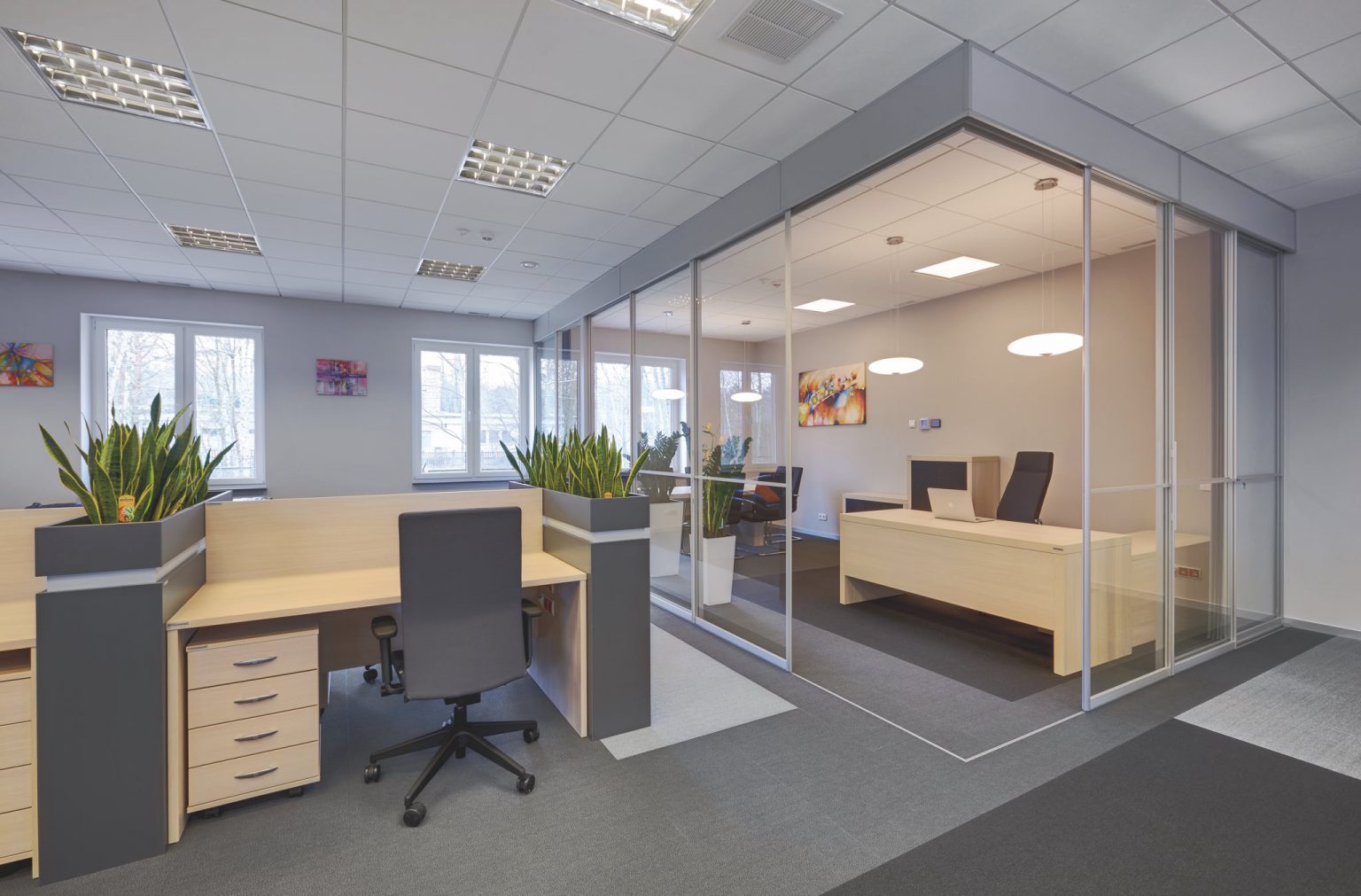 Еще один интересный и эффектный способ визуального разделения офисного пространства: