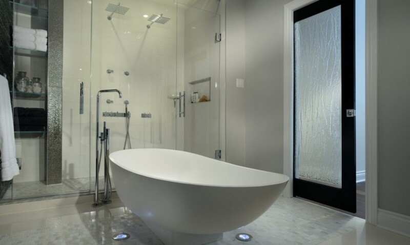Какие материалы рекомендуются в качестве внешней отделки и внутреннего содержания изделия, будет зависеть как от предпочтений конкретных материалов, так и от размеров помещения. В большой ванной, где поместится душевая кабина, унитаз, биде, раковина, и все еще остается свободное пространство, к материалу нет особых требований. Скорее всего, брызги вообще не долетят до дверной поверхности.