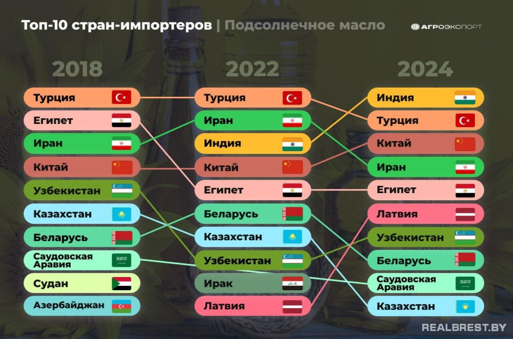 Ранее наша страна также входила в топ-10 импортеров подсолнечного масла из РФ: в 2018 г. Беларусь занимала 7-е место, в 2022 г. – 6-е место.