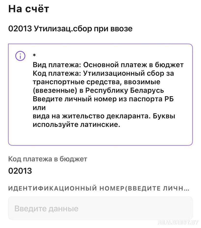 Дерево в системе Расчет ЕРИП → Таможенные платежи → Утилизационный сбор → Лица с паспортом РБ, видом на жительство или Юридические лица и ИП → 02013 Утилизационный сбор при ввозе — 02013 Утилизационный сбор за транспортные средства, ввозимые (ввезенные) на территорию РБ → Идентификационный номер (личный номер из паспорта РБ или вида на жительство).
