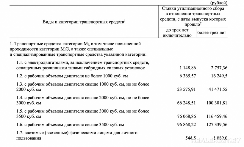 Важно обратить внимание на пункт 1.7 постановления СовМина РБ от 28 января 2025 года №50: именно он говорит нам о том, сколько будут платить физлица при ввозе авто для личного пользования. Напомним: в марте прошлого года (после предыдущего повышения) ставки составляли 544,5 рубля за машины в возрасте до трех лет включительно и 816,7 рубля за машины старше трех лет. Сравниваем с документом: изменения коснулись только последней категории авто — плюс 272,3 рубля. То есть физлица не сильно почувствуют изменения, если захотят пригнать авто из-за границы.