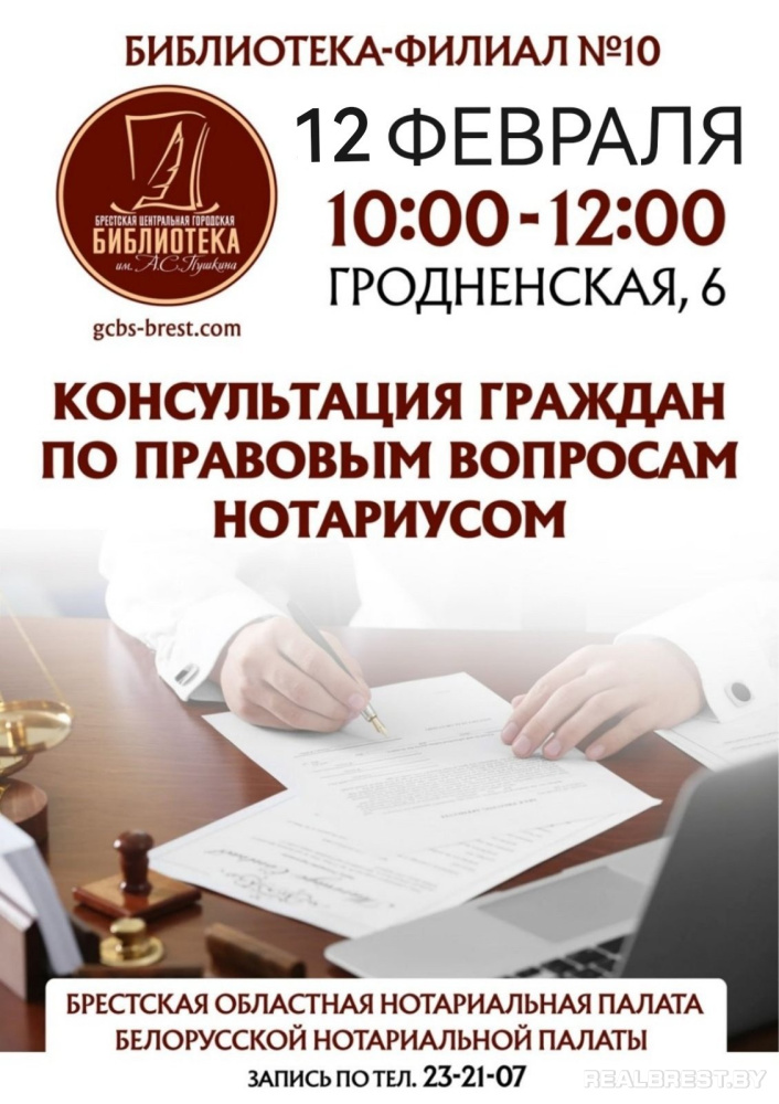 12 февраля с 10.00 до 12.00 Брестская областная нотариальная палата на базе библиотеки-филиала № 6 (ул. Гродненская, 10) проводит бесплатное консультирование граждан по правовым вопросам.