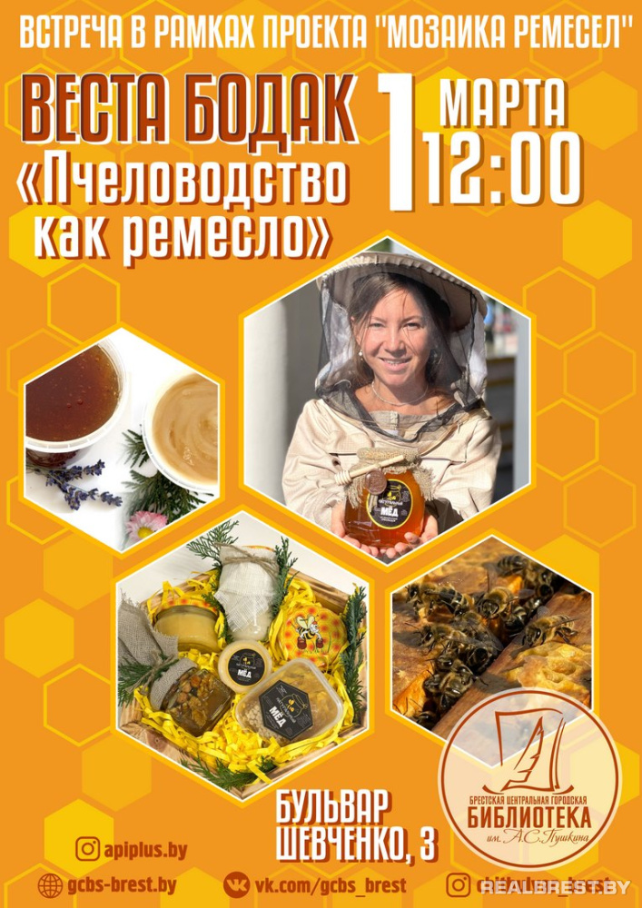 1 марта в 12.00 в рамках проекта «Мозаика ремёсел» в Центральной городской библиотеке им. А.С. Пушкина состоится встреча на тему «Пчеловодство как ремесло». В гостях – представители магазина «Пчеловодство и мёд».