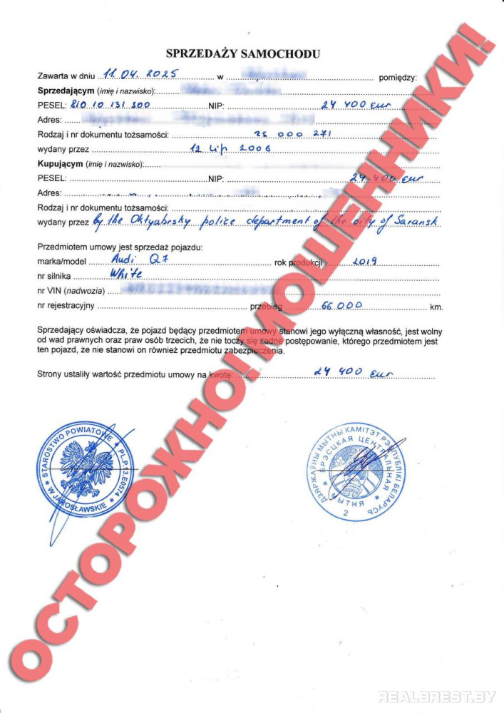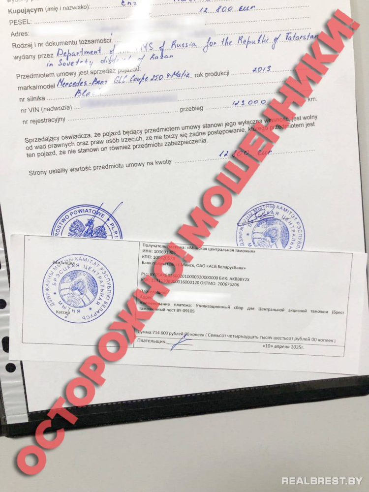 Аферисты даже не утруждают себя проверкой поддельных печатей на корректность наименования таможенных органов и грамматики их написания. В последних представленных обманутыми гражданами документах фигурирует печать с наименованием «Брестская центральная мытня», а в недействительных квитанциях утильсбор именуется как «Утилизационный сбор для Центральной акцизной таможни» (Брест таможенный пост ВУ-09105)».