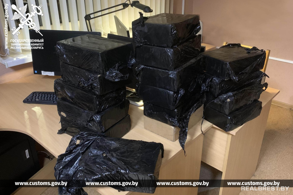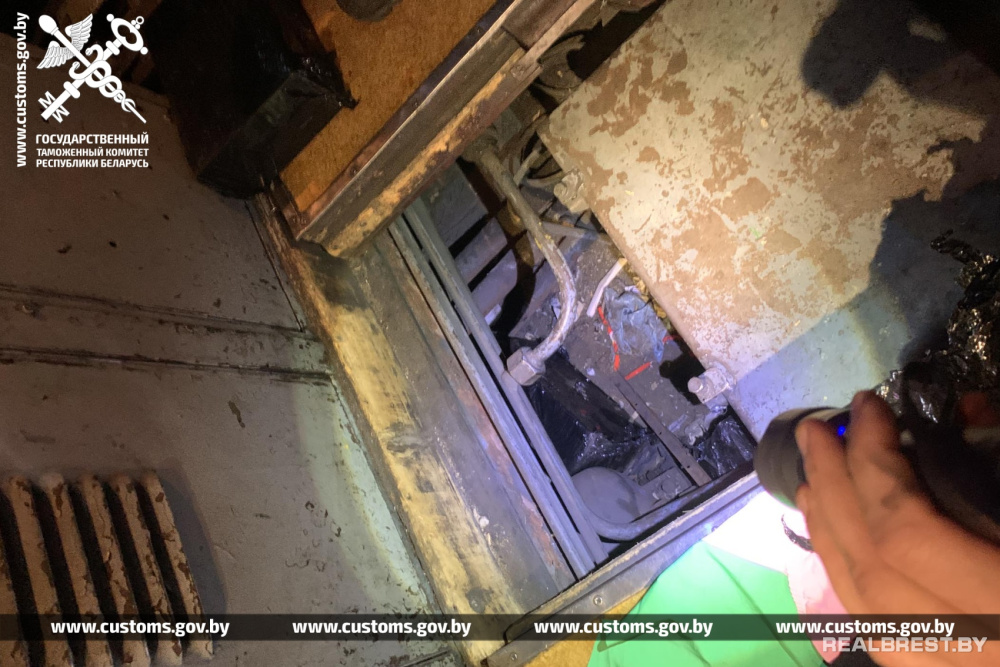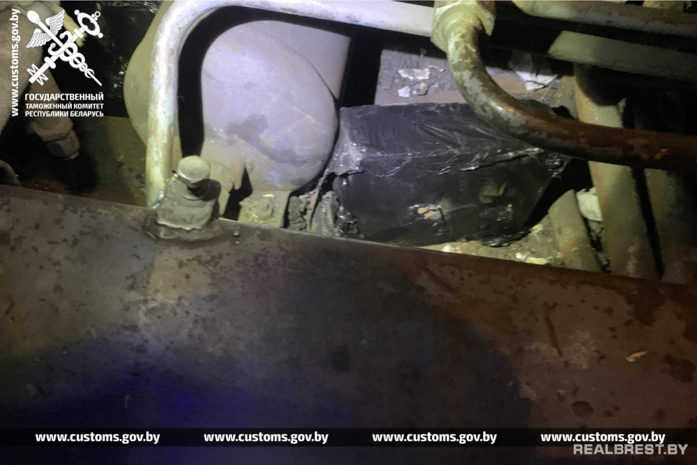 Место сокрытия товара брестские таможенники обнаружили в кабине бригады - подняв люк в полу, из пустотелого конструктивного пространства извлекли 18 картонных коробок, обмотанных черной пленкой.