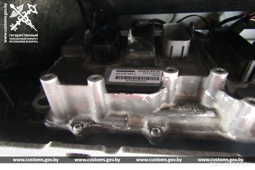 По результатам осмотра транспортного средства брестские таможенники приняли решение демонтировать пластиковую крышку в технологической полости над пассажирским сиденьем тягача. Из тайника извлекли блок управления двигателя б/у.