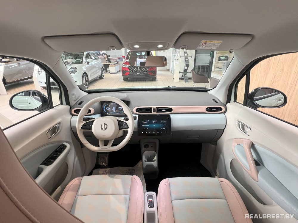 Внутри – 4-местный салон в разных цветах на выбор – в сером или трендовом бежево-розово-голубом цветах. Над головой – панорамная крыша с электрошторкой. Багажник рассчитан на 210 л, а со сложенными задними сиденьями – на 508 л. Предусмотрены кожаный мультируль, сенсорные экраны, аудиосистема с двумя динамиками, USB-порт и 12-вольтовая розетка для зарядки гаджетов.