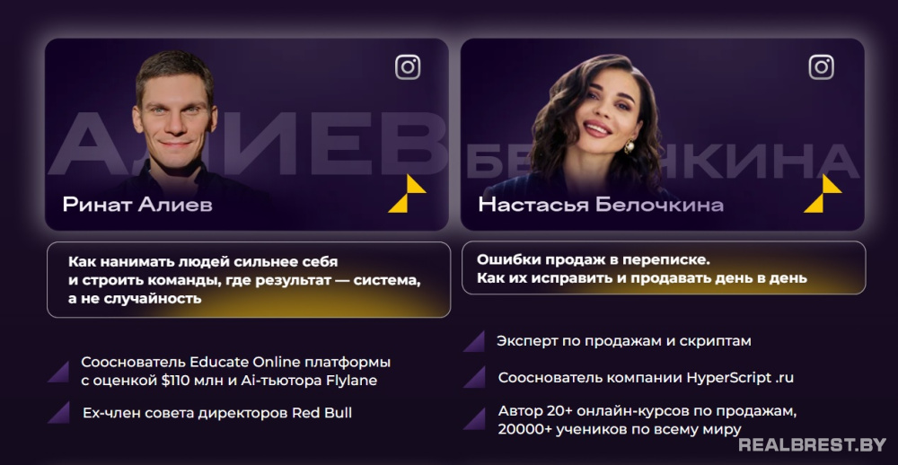 Среди спикеров - основатель рекламного агентства RTА, автор двух YouTube-каналов с аудиторией 900 тыс. подписчиков Павел Гительман; тренер по коммуникациям, основатель крупнейшей в СНГ онлайн-школы по речи «Голос может», выпускниками которой стали более 30 тысяч человек, Седа Каспарова; основатель компании Soscarrental по аренде авто в Дубае, блогер с аудиторией более 465 тысяч человек Ян Сташкевич.