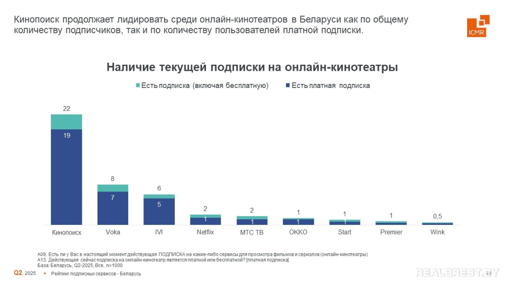В белорусском сегменте исследование охватило онлайн-кинотеатры и музыкальные стриминговые сервисы, включая оценку узнаваемости брендов, фактического пользования, а также наличия как бесплатных, так и платных подписок.