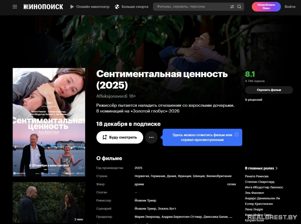 В декабре Кинопоиск, который исследование ICMR назвало онлайн-кинотеатром №1 в Беларуси, подготовил для свежие премьеры фильмов и сериалов. Среди них – обласканная критиками «Сентиментальная ценность» из Норвегии, новый «Дракула» от Люка Бессона, продолжение «Метода» и первый сезон «Обнальщика». Все киноновинки можно увидеть по подписке Яндекс Плюс.