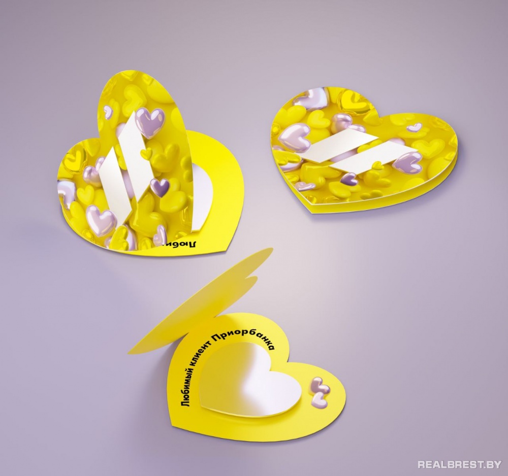 Если открыть сердечко, внутри — маленькое зеркальце и надпись «Любимый клиент Приорбанка». Намек прозрачный: любимый клиент — это тот, кто сейчас видит себя в отражении.