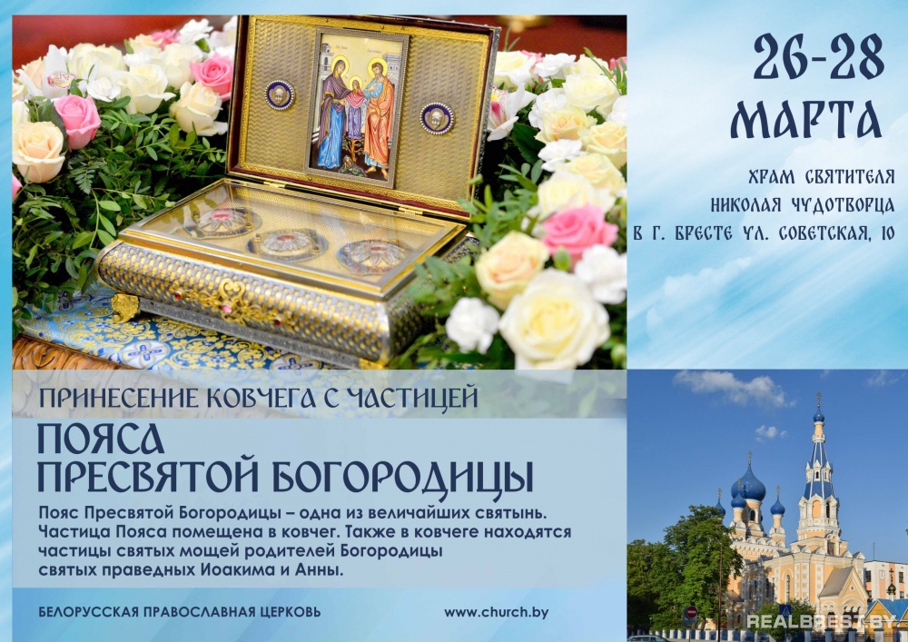 с 26 по 28 марта 2026 года в Бресте будет пребывать одна из величайших святынь — ковчег с частицей Пояса Пресвятой Богородицы и частицами мощей праведных Иоакима и Анны — родителей Пресвятой Богородицы. Место пребывания — храм святителя Николая Чудотворца в г. Бресте (ул. Советская, 10). Высылаем подробное расписание и приглашаем к сотрудничеству в освещении данного события. Напомним, что в 2024 году святыню уже привозили в Беларусь.